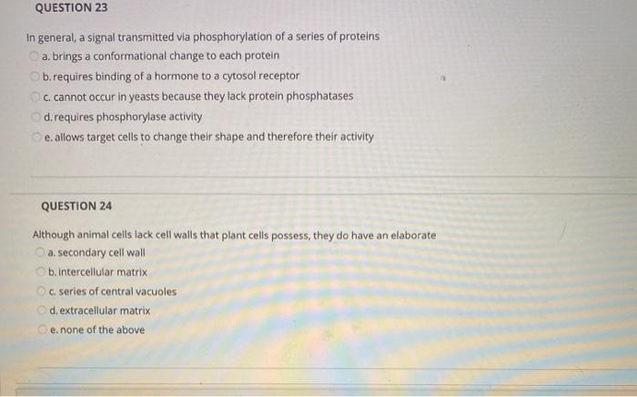 QUESTION 23 In general a signal transmitted via phosphorylation of a series of proteins a. Cis turned off by a kinase enzyme. Requires phosphorylase activity e.